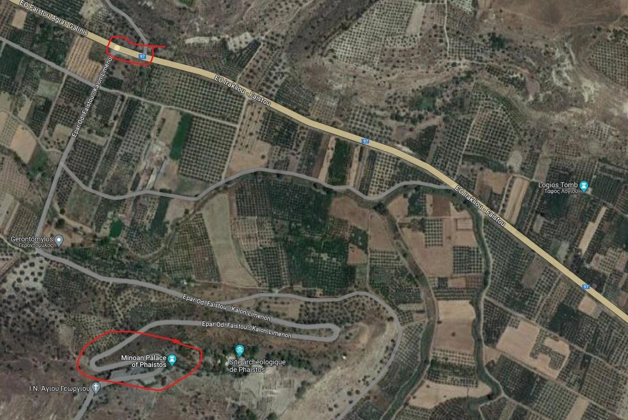 b. Take any bus from Heraklion to Tympaki/Agia Galini, these are more frequent. Ask the driver to stop at the bus stop on the road and walk from there (first red mark on the map). It’s a 30 mins walk, approx. 100m elevation, through olive groves and fields