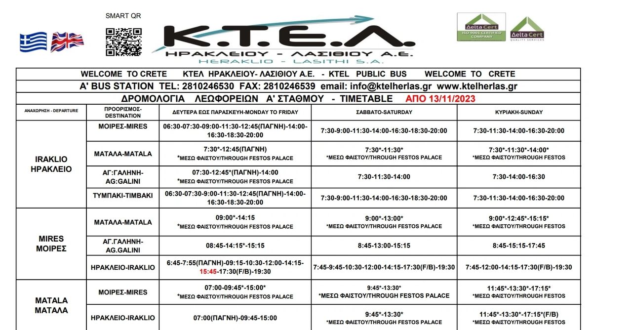 2. By bus – a little complicated. Meaning that there is no direct bus from Heraklion to Phaistos. You will have to take the bus in the direction Matala, at specific times! And you will have to change in Moires. Always check on ktelherlas.gr for the updated timetable and look for the *Through Festos Palace mark. The table below is for the winter period, in the summer there are more buses/day, especially Saturday and Sunday. Example:
