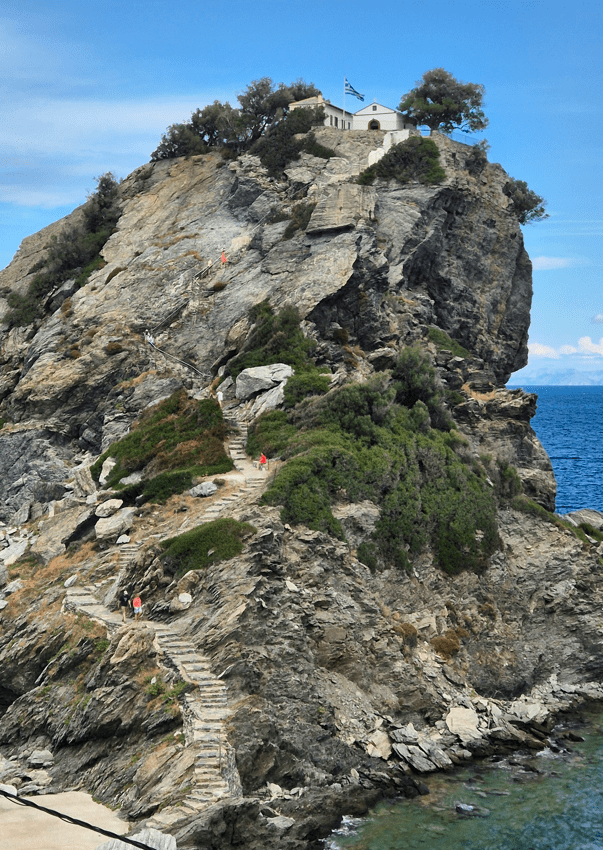 It can be visited during the stay at Kastani or Panormos. It takes around 40 mins and it is scheduled to the minute. You will have to book it on the boat and a 20 seat mini bus will wait for you at a specific meeting point to pick you up. Then drive to the chapel, which is on the other side of the island and then you have 20 mins or so to climb the stairs to the chapel or just take pictures and enjoy an ice cream. The stairs leading to the top are steep, there is no shade so make sure you wear suncreen, hat and comfortable shoes. NOT SUITABLE for people with mobility issues, height sickness, small children or people with heart conditions. If you miss the mini bus back, you will have to take a taxi back to Panormos, as public buses are not that frequent and the boat will just leave you there is you are not back when you are supposed to.